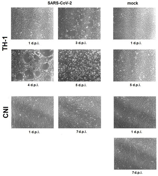 Changes in TH-1 and CNI reptile cell cultures infected with SARS-CoV-2, incubated at 29 °C. d.p.i.—days post infection.