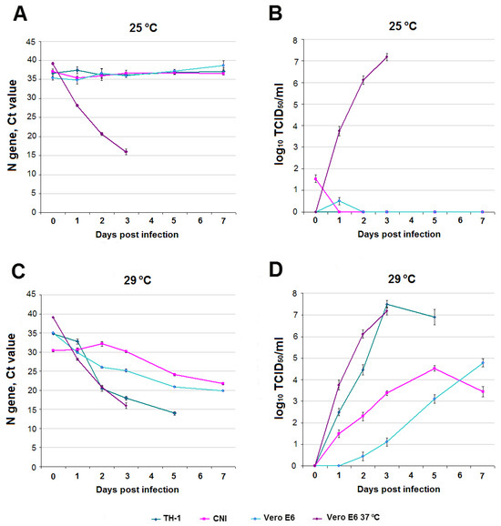 SARS-CoV-2 infection in TH-1, CNI reptile cell cultures, and Vero E6 reference culture. (A,C)—Ct values at 25 °C and 29 °C. (B,D)—infectious titer of SARS-CoV-2 log10 TCID50/mL at 25 °C and 29 °C. For comparison, data on SARS-CoV-2 infection in Vero E6 at 37 °C are presented.