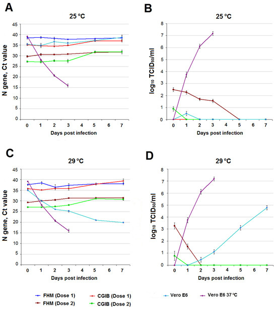 SARS-CoV-2 infection in fish cell cultures FHM, CGIB, and Vero E6 comparison culture over time. (A,C)—Ct values at 25 °C and 29 °C. (B,D)—infectious titer of SARS-CoV-2 log10 TCID50/mL at 25 °C and 29 °C. For comparison, data on SARS-CoV-2 infection in Vero E6 at 37 °C are presented.