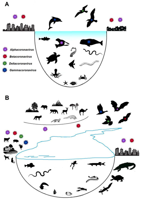 Natural routes of contact of animals in aquatic and coastal ecosystems with coronaviruses. (A)—oceanic and marine ecosystems; (B)—freshwater ecosystems.