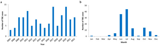 (a) Annual distribution of tick-borne encephalitis (TBE) cases (n = 126) and (b) monthly distribution of TBE cases (n = 126) between 2007 and 2022.