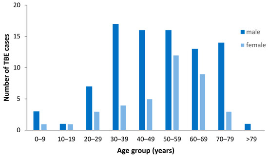 The maximum number of TBE cases was observed among 30–79-year-old males (range, 14–17 cases) and 50–69-year-old females (range, 9–12 cases). The largest sex-specific difference of cases occurred in the age groups from 30 to 39 years and from 70 to 79 years with a male-to-female ratio of 4.3 to 1 and 4.7 to 1, respectively. Children and adolescents aged below 20 years accounted for only a minority of cases (6/126; 4.8%) with a smaller predominance of male patients (male-to-female ratio: 2:1). All patients were hospitalized at the departments of neurology (83.3%), internal medicine (11.9%) or pediatrics (4.8%), respectively.