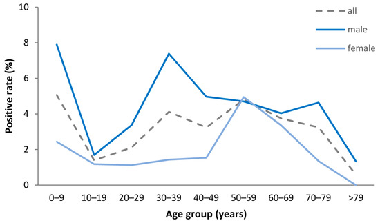 In 126 of 3713 (3.4%) investigated patients, acute TBEV infection was laboratory-confirmed by antibody detection or real-time PCR. The positive rate of TBE diagnosis varied over the year, positive rates were highest during the first (major) peak in June (8.4%) and July (10%) and lower during the second (minor) peak in October (5.0%) and November (3.0%), respectively. The overall positive rate was higher for male than for female patients (4.6% vs. 2.1%, respectively, p < 0.001). The positive rate for males exceeded those for females in all age groups with the highest absolute difference in the age group between 30 and 39 years (7.4% vs. 1.4%, respectively) but nearly equal positive rates between 50 and 69 years (Figure 3). The highest positive rates in adult patients were observed for males between 30 and 39 years (7.4%) and for females between 50 and 59 years (4.9%), respectively.