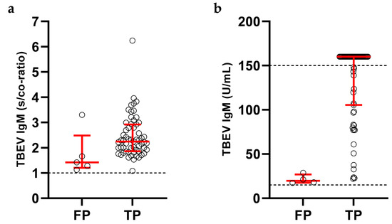 Comparison of tick-borne encephalitis virus (TBEV) IgM test reactivity between false-positive (FP) and true-positive (TP) test results for (a) Progen TBEV IgM assay (n = 5 [FP], n = 59 [TP]), (b) Virion\Serion TBEV IgM assay (n = 4 [FP], n = 63 [TP]). Each circle represents one sample. Median and interquartile ranges are indicated by red horizontal lines. The lower limit of detection (a,b) and the upper limit of quantitation (b) are indicated by dashed lines. s/co-ratio = sample/cutoff-ratio.