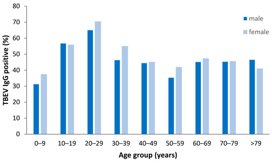 Prevalence of tick-borne encephalitic virus (TBEV)-specific IgG antibodies in serum from 3587 non-TBE patients (1808 males and 1779 females, respectively) according to sex and age group.