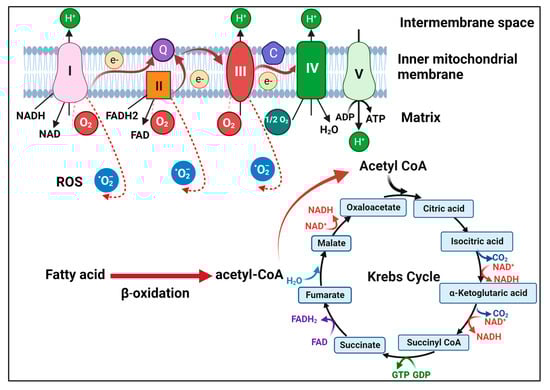 Illustration of mitochondrial metabolism. Fatty acids undergo β-oxidation to generate acetyl-CoA, which then drives the TCA cycle in the matrix of mitochondria. NADH and FADH2 generated by the TCA cycle donate electrons to complex I and complex II, respectively, on the inner mitochondrial membrane. The electrons are then transferred through ubiquinone (Q) to complex III and then via cytochrome C (C) to complex IV. The electrons are then transferred to the oxygen molecule to form water. During this process, complexes I, III, and IV pump protons to the intermembrane space to generate a proton gradient to drive ATP synthesis by ATP synthase (complex V). During OXPHOS, electrons may also leak and interact with oxygen to form superoxide (i.e., RSO).