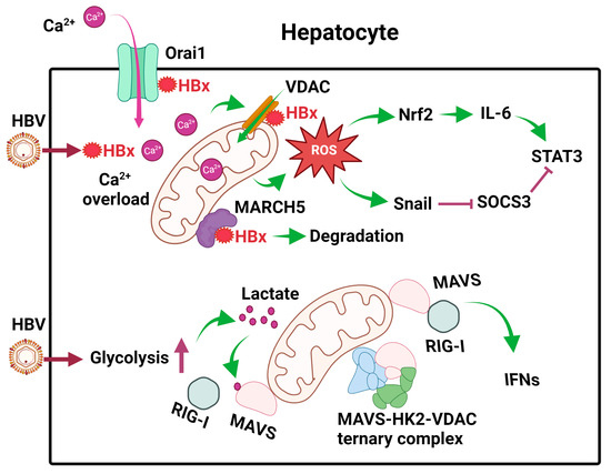 HBx has also been shown to bind to Orai1, a store-operated calcium entry component on the plasma membrane, to increase intracellular calcium levels via an influx of extracellular calcium [36]. This influx leads to an increase in calcium uptake by VDAC into mitochondria and the activation of calcium signaling pathways [37] (Figure 2). Thus, HBx exerts multiple effects on mitochondria to cause their dysfunction [38].