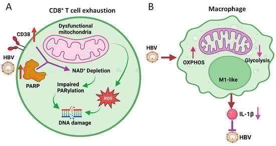 Effects of HBV on mitochondrial metabolism of CD8+ T cells and macrophages. (A) HBV induces the expression of CD38 and PARP1, resulting in the depletion of NAD+ and the subsequent inhibition of PARylation to cause DNA damage. ROS generated by dysfunctional mitochondria also cause DNA damage. This results in CD8+ T cell exhaustion. (B) HBV induces OXPHOS and inhibits glycolysis in M1-like macrophages to attenuate the production of IL-1β, which inhibits HBV replication.