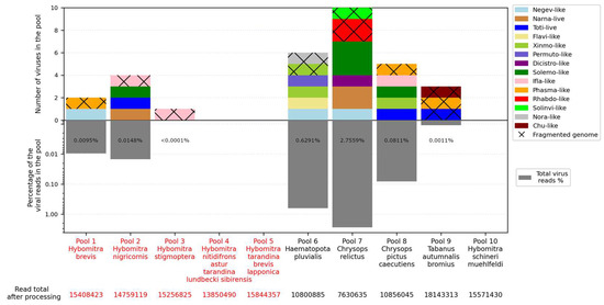 The numbers of viruses in the samples varied greatly. No virus was detected in three pools (pools 4, 5, and 10), while ten were detected in pool 7 (Chrysops relictus) and six were detected in pools 6 and 8. The presence of viral reads was low overall, reaching a maximum at 2.68% in pool 7.