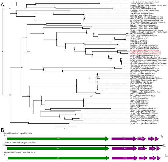 Genomic structure and phylogenetic relationships of the negev-like viruses described in this study. (A) Midpoint-rooted phylogenetic tree constructed using amino acid sequences of the ORF1 polyprotein (1000 bootstrap replicates; nodes with >70% bootstrap support are marked). Scale bar represents the number of amino acid substitutions per site. Discovered viruses are marked in red. (B) Scheme of the negev-like viruses’ genomes. RdRp-encoding ORF is marked in green. All other ORFs are marked in purple.