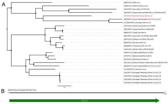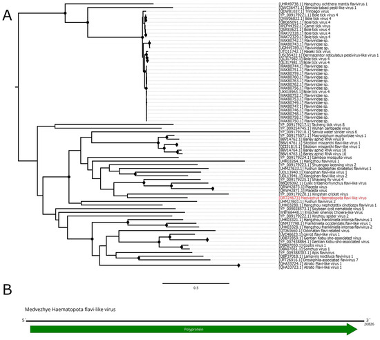 Genomic structure and phylogenetic relationships of Medvezhye Haematopota flavi-like virus. (A) Midpoint-rooted phylogenetic tree constructed using amino acid sequences of the polyprotein (1000 bootstrap replicates; nodes with >70% bootstrap support are marked). Scale bar represents the number of amino acid substitutions per site. Discovered viruses are marked in red. (B) Scheme of the Medvezhye Haematopota flavi-like virus genome. RdRp-encoding ORF is marked in green.