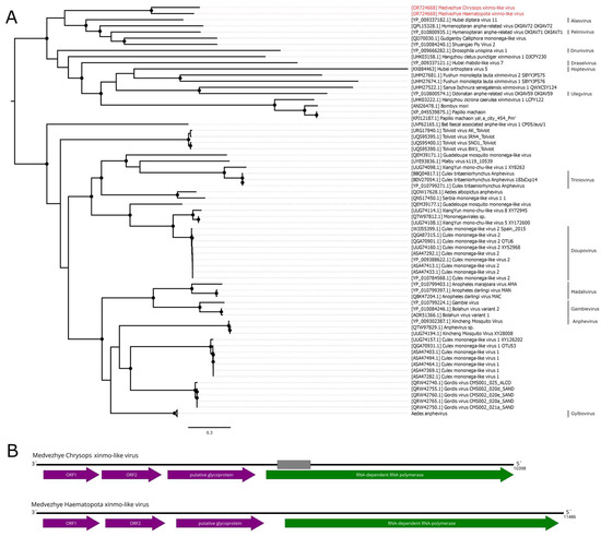 The abundance of MHXV in the pool was 0.18%, while that of MCXV was 0.01%. Phylogenetic analysis showed that MHXV and MCXV form a monophyletic group in the Xinmoviridae family polymerase tree (Figure 4A), with the closest relatives being viruses of diptera (Hubei diptera virus 11 [11], Shuangao fly virus 2 [12], and Gudgenby Calliphora mononega-like virus [40]) and wasps (Hymenopteran anphe-related viruses OKIAV72 and OKIAV71 [41]).