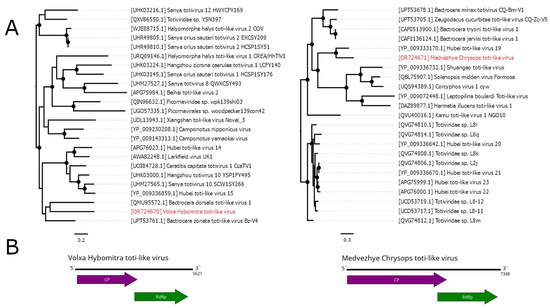Genomic structure and phylogenetic relationships of the toti-like viruses. (A) Midpoint-rooted phylogenetic tree constructed using amino acid sequences of RdRp (1000 bootstrap replicates; nodes with >70% bootstrap support are marked). Scale bar represents the number of amino acid substitutions per site. Discovered viruses are marked in red. (B) Scheme of Volxa Hybomitra toti-like virus and Medvezhye Chrysops toti-like virus genomes. RdRp-encoding ORF is marked in green. All other ORFs are marked in purple.