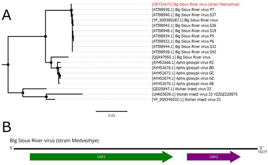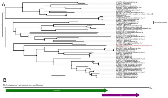 Genomic structure and phylogenetic relationships of Medvezhye pound Haematopota permuto-like virus. (A) Midpoint-rooted phylogenetic tree constructed using amino acid sequences of the polyprotein (1000 bootstrap replicates; nodes with >70% bootstrap support are marked). Scale bar represents the number of amino acid substitutions per site. Discovered viruses are marked in red. (B) Scheme of Medvezhye pound Haematopota permuto-like virus genome. RdRp-encoding ORF is marked in green. All other ORFs are marked in purple.