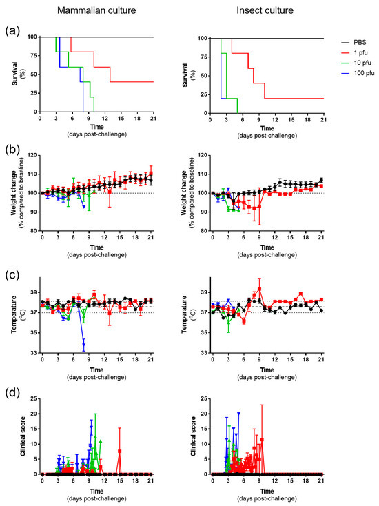 3.2. RVF Virus Cultivated in Insect Cells Results in a More Rapid Disease Progression, but the Same Dose Is Required for All Animals to Meet Humane Clinical Endpoints, Compared to Mammalian Cell-Grown Virus