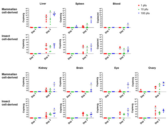 To determine early events after RVF virus infection, five mice from each challenge group were euthanised on days 1 and 3 post-challenge, with blood and tissues processed to assess viral RNA levels. This revealed only sporadic, low-level detection in samples collected at day 1; however, by day 3 post-challenge, more broad detection was observed (Figure 2). Viral RNA levels were highest in the liver with both challenge virus preparations. For the insect cell-derived virus, detection was observed across most tissue, including the blood, indicating systemic spread. Due to the slower disease progression with the mammalian cell-grown virus stocks, differences were more noticeable. Secondary sites of viral RNA detection included the spleen, kidney and ovary, where it was detected following challenge with different doses and prior to detection in the circulation.
