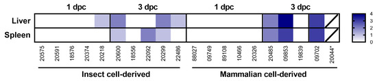 Heatmap representing the severity of microscopic lesions observed in the liver and spleen after challenge with 10 pfu RVF virus. Key: 0—normal, 1—minimal changes, 2—mild changes, 3—moderate changes, 4—marked changes. * found dead in the cage, samples not collected. Five-digit numbers refer to animal identification.
