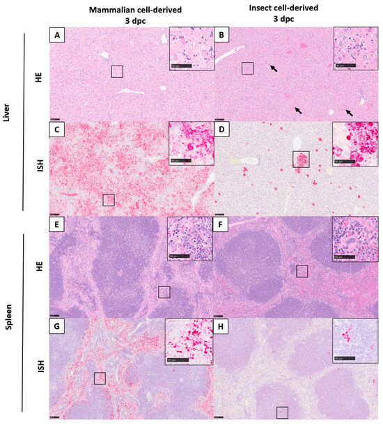 Microscopic lesions and viral RNA staining of animals infected with mammalian cell- (left) and insect cell-grown (right) RVF virus in the liver and spleen. Liver; multifocal hepatocyte degeneration and necrosis denoted by arrows (A,B) and viral RNA staining (C,D). Spleen; variable loss of mononuclear cells in the red and white pulp (E,F) and viral RNA staining (G,H). Inset, higher magnification images of the area highlighted by the smaller box in the main panel. HE, ISH. Scale bar denotes 100 μm for main panel and 50 μm for inset panels.