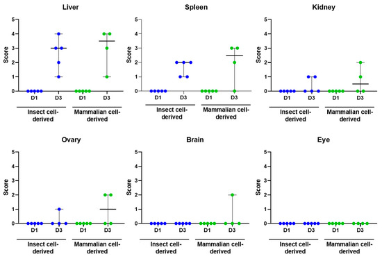 Scatter plots showing the degree of staining for RVFV RNA in the liver, spleen, kidney, ovary, eye and brain. Blue symbols denote insect cell-derived group and green symbols those challenge with mammalian cell-derived RVFV. Lines represent median plus 95% confidence intervals.