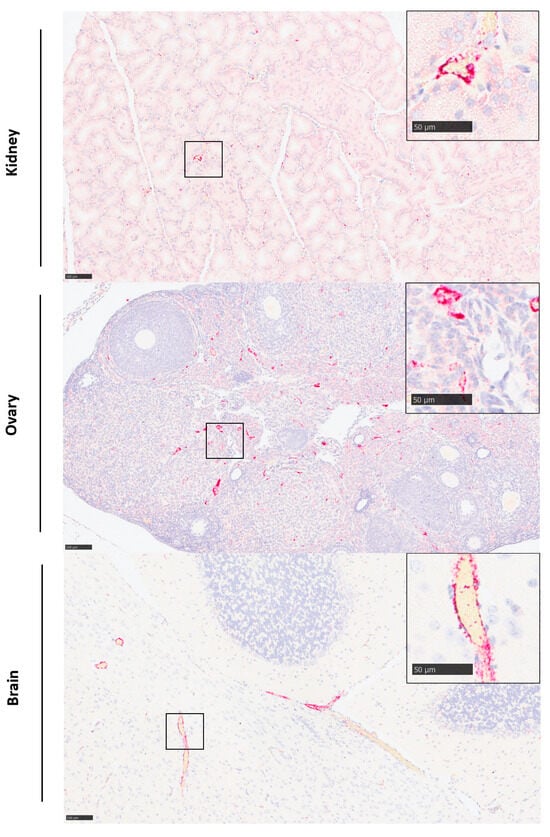 Viral RNA was not detectable by in situ hybridisation at day 1 post-challenge but was detected variably in all tissues examined at day 3 (Figure 5). Staining was most prominent in the liver (Figure 4C,D) and spleen (Figure 4G,H). In the liver, staining was visualised primarily within hepatocytes, with severity scores ranging from one to four in all animals from both groups. Stained cells were observed in cells in both the white and red pulp of the spleen, with severity scores ranging from one to two in all animals in the insect cell-derived group and two to three for 3/4 animals in the mammalian cell-derived group. In the kidney, viral RNA was detected in two animals in the insect-grown virus challenge group (score 1) and two animals in the mammalian-grown group (score 1–2); staining was prominent in the glomeruli as well as cortical and medullary interstitium (Figure 6, top). In the ovary, viral RNA was detected in scattered cells in one animal in the insect-grown group (score 1) and two animals in the mammalian-grown group (score 2) (Figure 6, middle). In the brain, viral RNA was detected in one animal in the mammalian-grown group (score 2); staining was present primarily in blood vessel walls in the neuropil, meninges (Figure 6, bottom) and other vascular structures (choroid plexus) throughout the brain, as well as other scattered cells in the neuropil. Staining was absent in the eyes of all animals from both groups.