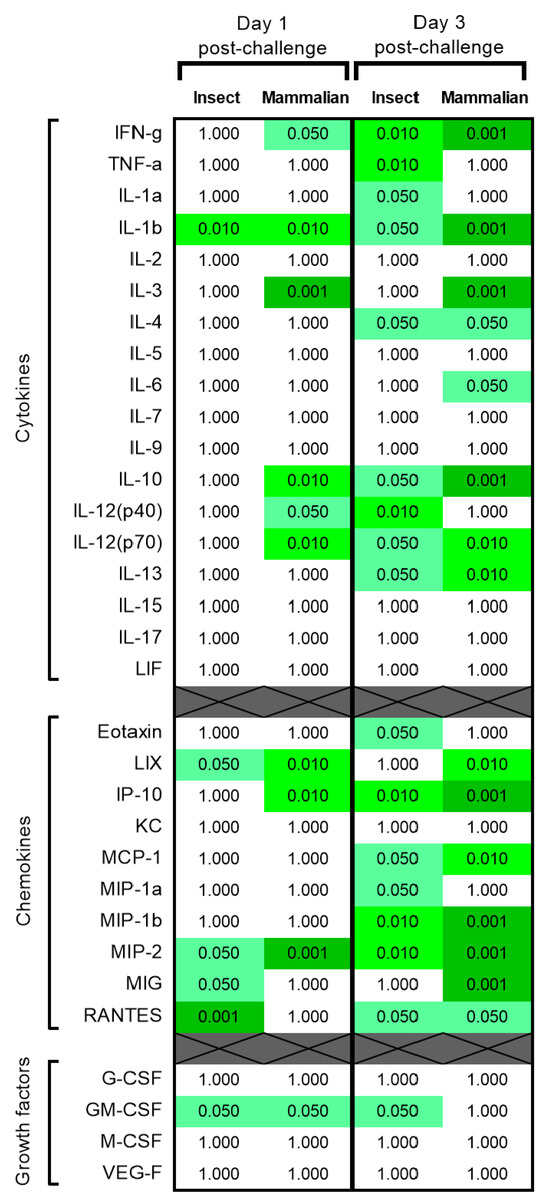 Statistically significant differences in cytokine, chemokine and growth factors concentrations in mice challenge with 10 pfu RVF virus compared to PBS control. Results show p values from Mann–Whitney statistical analysis. n = 5 animals per group. Where p > 0.05, a value of 1.000 has been assigned. Green coloured boxes denote statistical significance at a level less than the value contained within.