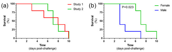 To assess reproducibility of the pathogenesis, a second study was conducted using the previously defined dose of 10 pfu, the lowest dose which uniformly resulted in all animals meeting humane clinical endpoints. Whilst our first challenge studies were conducted in female mice, an equal number of male and female mice (n = 5 per group) were used in this study. When female mice were compared between the two studies, all animals met humane endpoints by day 10 post-challenge, with no differences observed (p = 0.701, log-rank survival analysis) (Figure 8a). When the female and male mice were compared, the latter met humane endpoints more rapidly, which reached statistical significance (p = 0.023, log-rank survival analysis) (Figure 8b).