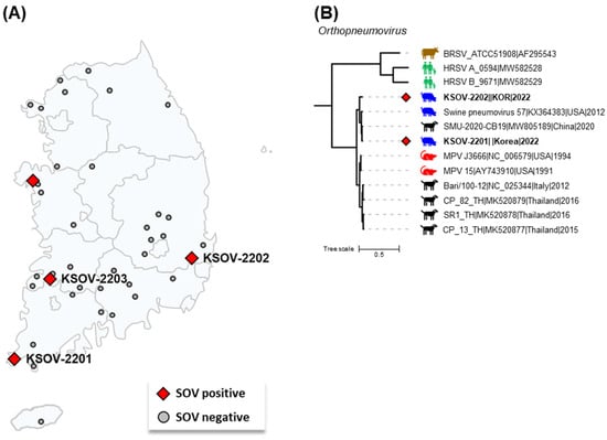 The geographic distribution and complete genome-based phylogenetic tree of Korean swine orthopneumovirus (SOV) strains. (A) The locations of the SOV-positive and SOV-negative farms have been shown as red diamonds and gray circles, respectively. The names of sequenced SOV strains have been shown next to the respective farms’ locations. (B) The phylogenetic tree was constructed with the complete genomes of MPVs, MPV-like orthopneumoviruses, and the reference strains of BRSV, HRSV type A, and HRSV type B. The two Korean SOV strains are shown as red diamonds. Scale bars indicate nucleotide substitutions per site.