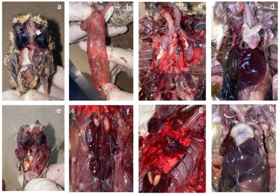 Gross pathological lesions associated with LPAI H9N2 infection in houbara bustards and gamebirds. Photos (a–d) represent pathological lesions observed in H9N2-infected bustards: (a) fibrinous sinusitis, (b) congestive and exudative tracheitis, (c) intrabronchial fibrin cast, (d) fibrinous pericarditis with liver congestion. Photos (e–h) represent lesions observed in gamebirds: (e) fibrinous sinusitis in a Barbary partridge, (f) kidney congestion and hypertrophy in a Barbary partridge, (g) lung congestion in a Japanese quail, (h) fibrinous pericarditis and perihepatitis in a Barbary partridge.