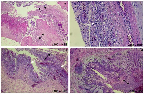 Histopathological lesions of the trachea and lungs in a confirmed LPAI H9N2 infection in a houbara bustard with coinfection with E. coli associated to Staphylococcus Aureus: (a) Trachea. Fibrino-heterophilic material accumulated in the tracheal lumen (double-headed arrow); note the intralesional dense bacterial colonies (black arrow), (b) Trachea. Congestion of blood vessels with lympho-plasmocytic and heterophilic infiltration in the lamina propria (white arrow), (c,d) Lung. Severe congestion in the bronchial mucosa associated with lymphocytic and heterophilic infiltration (white arrow) and accumulation of cellular and fibrino-necrotic material in the bronchial lumen (double-headed arrow).