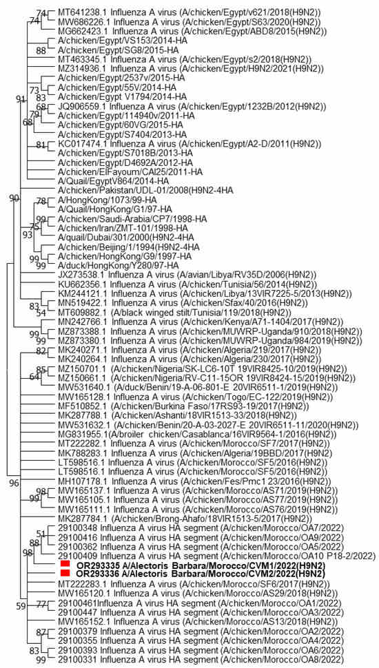 - Amal, E.B.; Saâdi, N.; Asma, F.; Moncef, B.; Ouafae, F.F. Characterization and phylogenetic analysis of the hemagglutinin gene in H9 influenza viruses from chickens in Morocco from 2017 to 2019. Avian Dis. 2020, 64, 310–314. [Google Scholar] [CrossRef] [PubMed]