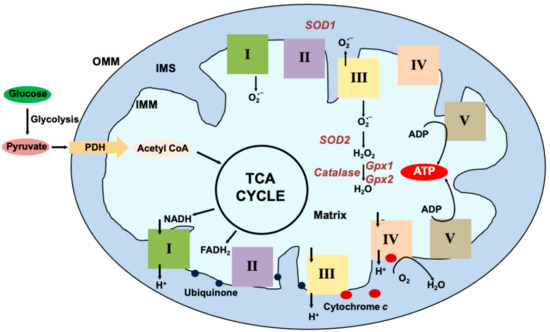 Mitochondrial Oxidative Phosphorylation: Glucose, the primary energy substrate is metabolized via glycolysis into pyruvate. From the cytosol, pyruvate enters the mitochondria via the transporters and is decarboxylated by Pyruvate dehydrogenase (PDH) to form Acetyl Coenzyme A (Acetyl CoA) that is used in the Tricarboxylic Acid Cycle (TCA). Reducing equivalents generated in the form of NADH and FADH2 are funneled into Complex I (I) or Complex II (II) embedded in the inner mitochondrial membrane (IMM) respectively. Ubiquinone (blue circles) transfers the electrons from I and II to Complex III (III). Cytochrome c (red circle) transfers the electrons from III to Complex IV (IV) where it is used to reduce molecular oxygen to H2O. As the electrons pass through the complexes, protons (H+) are pumped into the intermembrane space (IMS) creating a gradient across the IMM. The energy from this gradient is used by complex V (V) also known as ATP synthase to generate ATP from ADP. Some electrons escape and react with molecular oxygen to form superoxide (O2•−) at I and III. Superoxide is generated on the matrix side at I and both on the matrix and IMS side at III. Superoxide dismutase (SOD) 1 and 2 localized to the IMS and the matrix respectively scavenge the superoxide to generate H2O2. Glutathione peroxidases further breakdown the peroxide to H2O.
