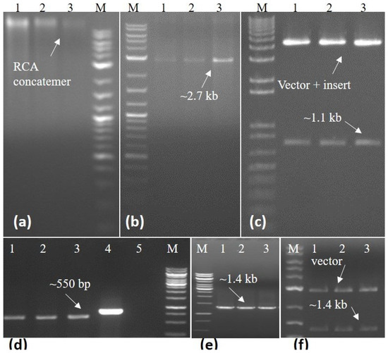 The isolated DNA was quantified and dilutions were prepared for use in PCR reaction using begomovirus-specific primers, amplifying an approximately 550 bp fragment of the CP gene in standardized PCR conditions [14] (Figure 2d). The full-length begomovirus genome was amplified in rolling circle amplification (RCA) using phi 29 DNA polymerase in the TempliPhi 100 Amplification Kit (GE Healthcare, Life Sciences, Piscataway, NJ, USA), following established protocols [15]. The concatemer of RCA products was then subjected to restriction fragment length polymorphism (RFLP) to release monomer molecules. Finally, utilizing the BamH1 restriction enzyme, a full-length linear molecule of the begomovirus was generated and subsequently cloned into pGEM5Zf+ (Promega, Madison, WI, USA) (Figure 2a–c). Simultaneously, the betasatellite was amplified with betasatellite-specific primers and cloned into the pTZ57R/T cloning vector (Thermo Fisher Scientific, Waltham, MA, USA) (Figure 2e,f).