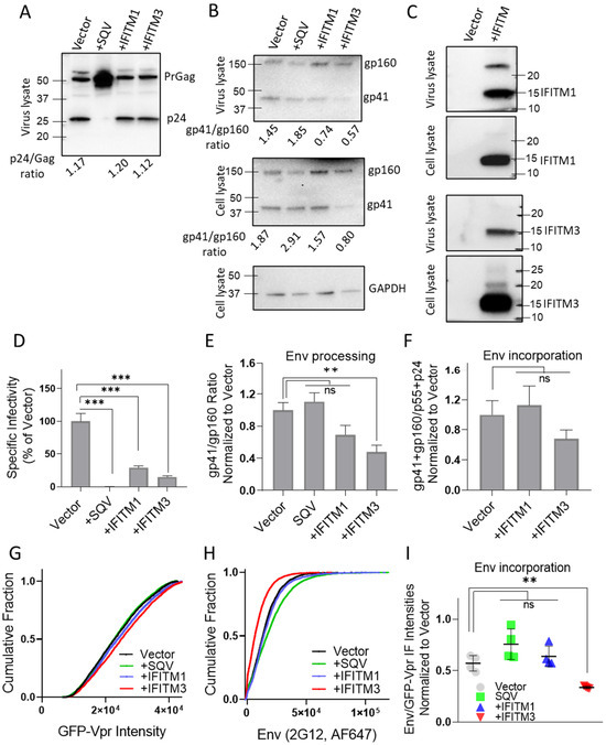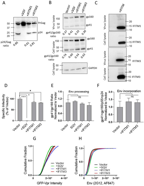 HIV-1 pseudoviruses were produced by transfecting HEK293T/17 cells using JetPRIME transfection reagent (Polyplus-transfection, SA, New York, NY, USA), as described previously [34]. HEK293T/17 cells grown in 6-well tissue culture plates were transfected with HXB2 Env or AD8 Env-expressing plasmid (0.6 μg), pR9ΔEnvΔNef (0.8 μg), eGFP-Vpr (0.14 μg), pcRev (0.2 μg), or 0.3–1.0 μg of either pQCXIP-IFITM1, pQCXIP-IFITM3, or empty pQCXIP expression vectors. To produce immature viruses, 300 nM of SQV was added to a growth medium, as indicated. The transfection medium was replaced with phenol-free DMEM/10%FBS after 10–12 h, and the cells were further incubated for an additional 34–36 h at 37 °C, 5% CO2 incubator, after which, the virus-containing culture medium was collected, passed through a 0.45 μm filter, and concentrated 10× using Lenti-X concentrator (Clontech, Mountain View, CA, USA). The cells were harvested and lysed, as described elsewhere [50]. The virus was precipitated after an overnight concentration with Lenti-X by centrifuging at 1500× g for 45 min at 4 °C, resuspended in PBS, and kept at −80 °C. The p24 content of pseudoviruses and protein content of cell lysates were determined by ELISA [51] and BCA [50] assays, respectively.