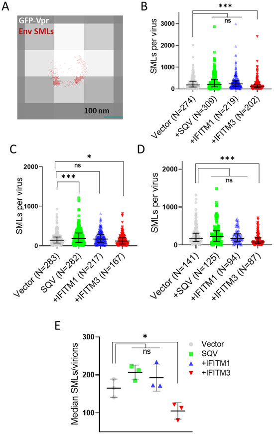 We next visualized the distribution of Env on HIV-1 GFP-Vpr-labeled pseudoviruses by direct stochastic optical reconstruction microscopy (dSTORM). Single-molecule Env localizations (in red) overlaid onto diffraction-limited images of GFP-Vpr (gray) (Figure 3A) reveal a non-uniform Env distribution on virions, with a tendency to form clusters. Consistent with the reduced Env signals observed in immunoblots and by wide-field fluorescence imaging of single virions, fewer SMLs were detected by dSTORM on IFITM3 pseudoviruses for three independent biological replicates (Figure 3B–D). Lower median SMLs were detected for IFITM3 pseudoviruses compared to other pseudoviruses in independent panels (Figure 3E). To ensure that a statistically significant reduction in the Env SMLs for IFITM3-containing particles was not the result of the large sample size, we applied the optimal binning protocol to reduce the effective sample size of our data [54]. This approach confirmed that pseudoviruses produced by IFITM3- but not IFITM1-expressing cells had, on average, fewer SMLs than control particles (Figure S7).