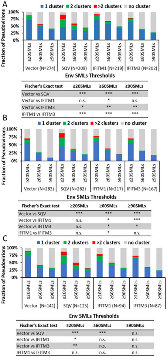 Effect of IFITMs incorporation on Env distribution on single HIV pseudovirions imaged by 2D dSTORM. Clusters of Env localizations obtained by dSTORM were defined for three independent pseudoviral preparations by the DBSCAN algorithm for a fixed search radius of 15 nm and varied minimum number of SMLs (from ≥20 to ≥90) within that radius. (A–C) Fractions of virions containing different numbers of Env clusters: 1, 2, or >2 clusters or no clusters as a function of the DBSCAN single-molecule localization threshold are plotted. The three graphs represent three independent virus preparations. The number of pseudoviruses analyzed (N) is shown in parentheses under the graphs. Statistical analysis was performed using Fisher’s exact test. Significance: n.s., p > 0.05; *, 0.05 > p > 0.01; **, 0.01 > p > 0.001; ***, p < 0.001.
