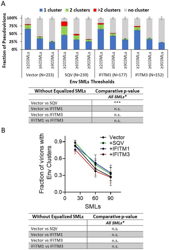 Finally, two-way repeated measures beta regression models were employed to determine whether Env clustering differs between the viruses in a panel (e.g., control vs. SQV), for virions with different numbers of clusters (i.e., no clusters, 1, 2, 2+ clusters), and over three biological replicates. These regression models included virus treatment and the number of clusters as main effects, along with their two-way interaction. These regression models were calculated in the full dataset, stratified by SML thresholds (≥20, ≥60, ≥90), and p-values are presented unadjusted. As outcome proportions in our data were often inclusive of 0%, and beta regression requires outcome values to be greater than 0% and less than 100%, we added a transformation, described by Smithson and Verkuilen [57], to our outcome proportions prior to any regression analysis. Beta regression analysis was carried out in SAS v.9.4 (SAS Institute, Cary, NC, USA), and statistical significance was evaluated at the 0.05 threshold.