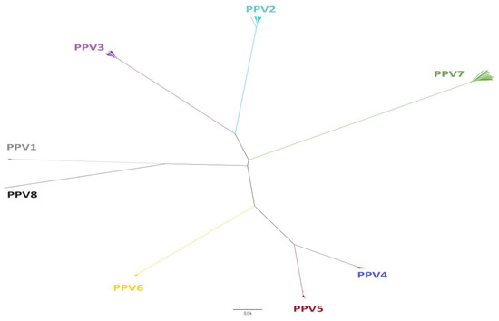 Phylogenetic distribution of porcine parvoviruses (PPVs). It was inferred based on complete nucleotide sequences of the non-structural gene (NS) selected from representative strains of PPV1 through PPV7 obtained from the GenBank. The evolutionary tree was constructed with the neighbor–joining method by the p-distance model. The analysis involved 201 nucleotide sequences. Evolutionary analyses were conducted in MEGA7 [28].