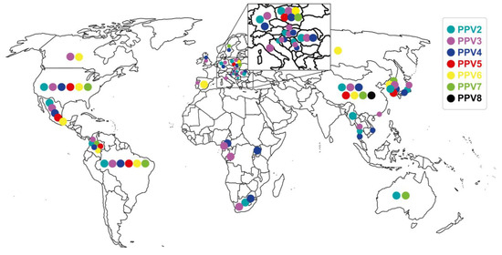 Global distribution of novel porcine parvoviruses (nPPVs), PPV2 through PPV8. Graph prepared on the geographical location of the nPPVs in literature reports and the origin of the sequences deposited and accessed from GenBank.
