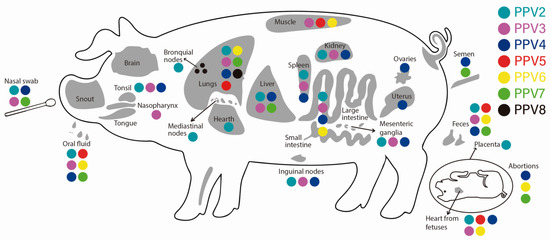 The fact that PPVs have been detected in different types of samples (tissues) and with varied prevalences suggests that they have a broad tropism. For PVV1, tropism both in organs (in vivo) and at the level of cell cultures (in vitro) has been widely studied [53]. PPV1 has a tropism for macrophages that migrate to the placenta, where the virus replicates and infects the fetus, disseminating within it and affecting various organs, mainly the lung tissue [4]. Regarding the tropism of nPPVs, these viruses have been detected in high loads in the serum [13,73,95] and the tissue, mainly in lung and lymphoid organs such as the spleen, tonsils, and lymph nodes [10,24,73]. At the respiratory system, the majority of nPPVs have been detected in nasal swabs (PPV2 to PPV 4 and PPV7) [10,24,97], lung tissue (PPV2 to PPV8) [13], bronchoalveolar lavages [14,33], and in bronchial lymph nodes [24]. In pigs with PRDC, the most detected nPPV is PPV2, with prevalences reaching 75% [24] and, to a lesser extent, PPV3 to PPV6 [13,24]. PPV2 has also been detected in high prevalence in the tonsils [24,57,74] and heart. In the gastrointestinal system, PPV2 was detected in samples of both oral fluid and feces in healthy pigs [95], while evaluation of pools of large intestine and feces revealed the presence of PPV2 to PPV4 and PPV6 [98] (Table 2). PPV3 and PPV7 were detected in high prevalence in the liver, the former in both domestic and wild pigs [10,79] while the latter only in domestic pigs [99]. In the urinary system, PPV2 to PPV4 has been found in the kidney [24]. In the reproductive system, it should be noted that in sows with PRF, all PPVs have been detected (except PPV8), particularly in the hearts of aborted fetuses and in those coinfected or not with PCV2 [24,78] (Table 2 and Table 3). Breaking down the above, in aborted fetuses, PPV2 has been detected with varied prevalences. For example, in a low proportion (1.3%) it has been detected in thoracic fluids [73,77] and a very high proportion (93%) in hearts [78]. For PPV3 and PPV5, the results are contradictory since there are studies where they were not detected in fetal samples [10,73], while in others, their prevalence reached 30% [78]. For PPV4, PPV6, and PPV7, studies report their high prevalence in aborted fetuses [12,73,100], while PPV4 and PPV7 in semen [39,73]. In reproductive organs, PPV4 was detected in ovaries and uteri [90], suggesting its potential vertical transmission. In this sense, it should be noted that no nPPVs have been reported in colostrum or milk [63]. At the nervous system level, no nPPVs have been found in the central nervous system (CNS), unlike PPV1, which was found in fetal brains in both natural and experimental infections [101], indicating its tissue tropism. The distribution of nPPVs (PPV2 through PPV8) in different organs, excretions, and at the fetal level is compiled in Figure 3.