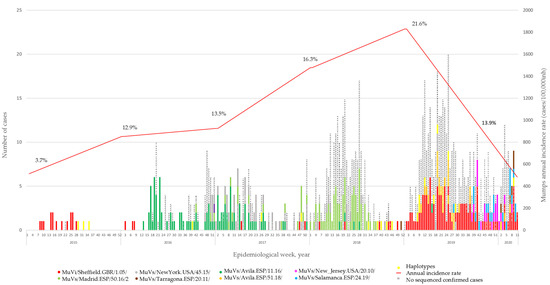 Temporal distribution of mumps virus SH variants and haplotypes in the Community of Madrid from 2015 to 2020. The Y-axis shows the number of confirmed cases (PCR-positive) and the annual incidence rate of mumps per 100.000 inhabitants in the CM. The X-axis represents the epidemiological weeks, grouped into years. The percentages represent positive cases detected in the CNM-ISCIII out of the total number of cases reported in the same year. Cases belong to the variants and haplotypes are coloured according to the legend assignation.