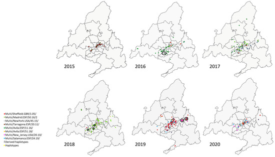 A cluster formed by four cases of the MuVs/NewYork.USA/45.15/ SH variant was observed in 2016 in the district of Fuenlabrada, in the south of the Community of Madrid (Figure 2, year 2016). Additionally, another SH haplotype, MuVs/Madrid.ESP/13.17/4, was identified within this cluster, sharing with MuVs/NewYork.USA/45.15/ the characteristic nt substitution C248T, but also G179T, which suggests a possible local-evolution origin, according to the evolution rate (1.7 × 10−3 substitution/site/year) [28].