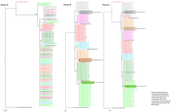 A total of 90 MF-NCR sequences from the previously described clustered cases were obtained, in order to explore correlations with geographical clustering (Supplementary Materials Table S1). Subsequently, the potential usefulness of this marker for establishing relationships among cases of mumps at the local level was studied. The phylogenetic analysis of these MF-NCR sequences (Figure 3, Panel A) showed a smaller number of clades than the SH sequences of the corresponding cases (Figure 3, Panel B), because the MF NCR has less nt variability than SH, as previously cited [2]. Nevertheless, the tree topology of MF-NCR and SH concatenated sequences showed different clusters associated with the MuVi/Sheffield.GBR/1.05/, MuVs/Avila.ESP/11.16/ and MuVs/Madrid.ESP/50.16/2 SH variants, during the period of study (2015–2020) (Figure 3, Panel C).