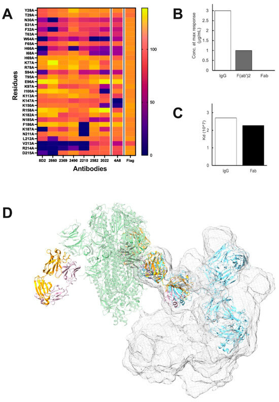 - NIEAs of distinct genetic origin were shown to compete with each other. This observation was supported by mutagenesis, which identified a narrow patch of residues on the NTD distal from the spike–ACE interface. The location of the epitope was further demonstrated by the Cryo-EM studies using fragment antigen-binding regions (Fabs), which revealed a binding mode in which the Fab makes an angle of approximately 30 degrees with the spike axis. The cryo-EM result agreed very well with docking models, as well as with an earlier anti-NTD monoclonal antibody cryo-EM structure, although ACE2 binding enhancement was not reported for the antibody in this structure [11]. Further support came from an independent report of a set of NIEAs whose structural and functional properties matched those described by Liu and co-workers [12]. Due to the dynamic nature of the spike itself, the side chains of interface residues were not resolved in the two published studies of spike-bound NIEAs, leaving open the question of the detailed atomic structure of this interaction. The effect of alanine substitutions on the NIEA-enhancing effect is shown in Figure 1A;