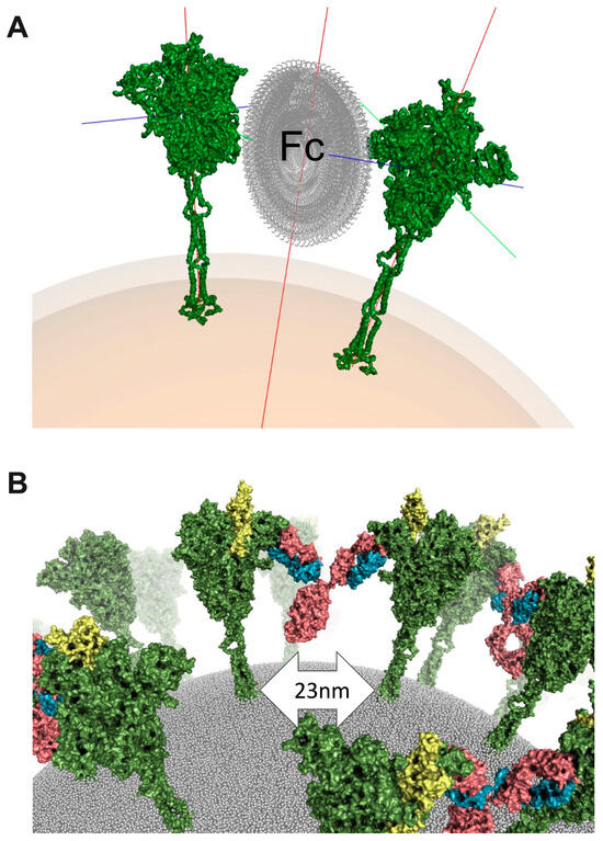In order to investigate the plausibility of a spike–NIEA–spike crosslinking model, we again utilized known IgG structures and the low-resolution NIEA Fab–spike structure. In brief, pairs of Fab–spike complexes were positioned relative to each other by uniformly sampling spherical coordinates specified by the envelope radius and two rotational degrees of freedom. Known IgG antibodies were then fitted onto the two Fabs. Under a given assumed envelope radius, different combinations of the two rotational degrees were sampled. Cross-linked models were then ranked according to the quality of the fit of the two Fabs. Finally, top models with different spike orientations were selected as candidates (Figure 2A). The cross-linked spikes were further modeled in a realistic plasma membrane (Figure 2B). Encouragingly, the spike–spike distance in cross-linked models (23 nm) agreed well with the mean value observed in Cryo-EM tomography of 100 spike pairs in whole virions: 23.6 ± 8.1 nm [45].