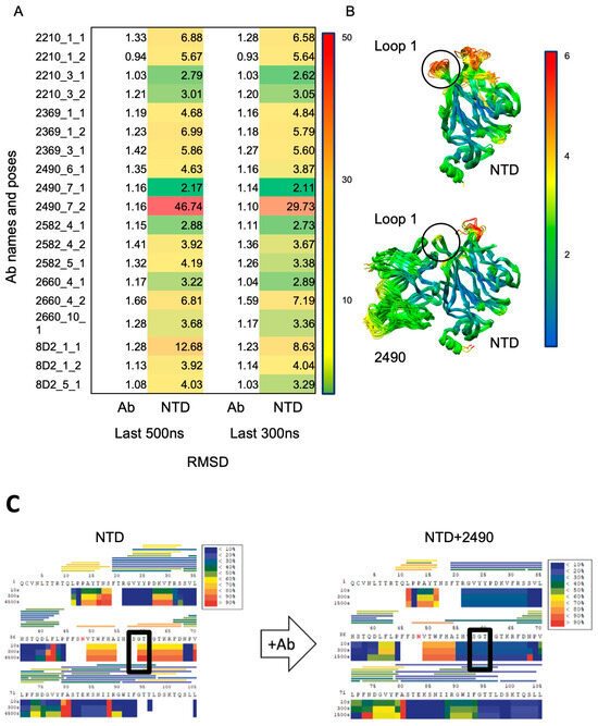 To better resolve the interface of the antibody–NTD complex at atomic resolution, we performed MD simulations using a Fab instead of a full antibody. A total of nineteen 1 µs simulations were performed starting from different docked conformations of the six NIEA Fabs to the NTD. As a reference, a single NTD was also simulated. During the simulations, the Fab and NTD fragments rearranged themselves, optimizing their relative orientation with respect to the docked conformation. The RMSD analysis indicates that some complex models converged to stable conformations with the average RMSD values from the last snapshot structure less than 3 Å (Figure 3A). Figure 3B shows the structural ensembles obtained from the simulation of the NTD alone and from that of model 2490_7_1, which showed the smallest average RMSD value. RMSF calculations showed that both the Fab and the NTD fragments were internally stable (RMSF < 2 Å) in most regions; however, the flexible loops of the NTD (loops 1–3) exhibited large fluctuations. Comparison of the NTD and NTD–Fab simulations showed that antibody binding resulted in a stabilization of NTD loop 1, which contains several residues identified by Liu et al. [5] as belonging to the overlapping epitope.