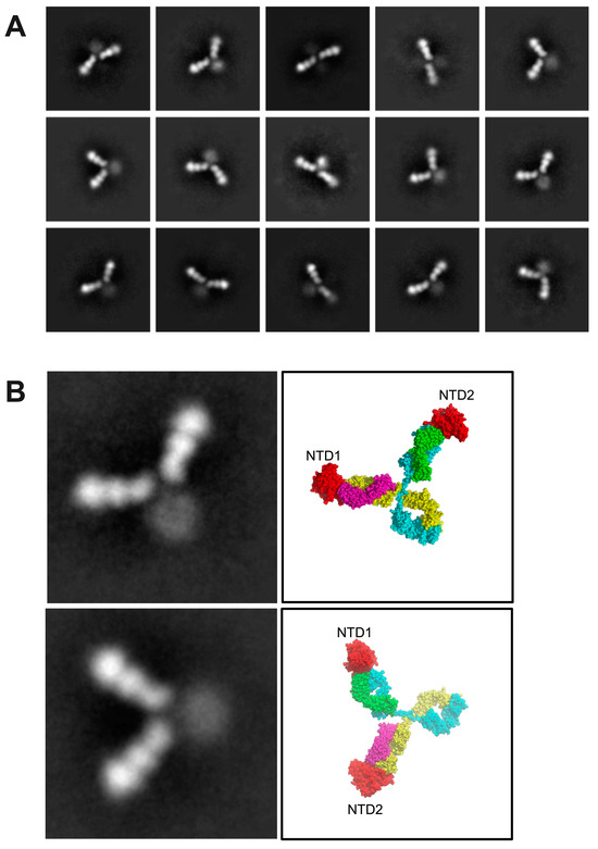 Consistent with this prediction, the NTD–NIEA–NTD trimers were clearly visible through negative stain imaging. A total of 165,539 particles were picked by template matching. After three rounds of 2D classification, typical 2D class images are shown in Figure 4A. In each class image, the density corresponding to the NTD and Fabs was clearly visible, while that of the Fc was weak and blurry, suggesting that the Fc region is highly flexible. NTDs bound to both Fab arms in all classes. In addition, the angles between the two Fabs varied considerably, indicating the flexibility of the IgG hinge region. Two well-resolved 2D classes are shown, which agree qualitatively with the cross-linked structural model constructed previously (Figure 4B).