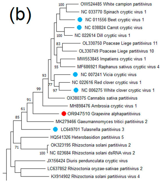 VCV was discovered in 2021 on a wild Vitis coignetiae in northern Japan [93]. It is a dsRNA virus from the family Partitiviridae with two segments encoding the RdRp and CP genes, respectively. It was found in cultivated grapevines in China [94] and Russia [21]. To date, the symptoms associated with VCV are unknown. VCV was identified in two libraries, and the complete sequences of both RNAs were obtained for one sample. At the time of this study, only six complete VCV genomes were available in the world: two from Russia and four from Japan. A phylogenetic analysis (Supplementary Figure S15) showed low values of bootstrap support of nodes (45–70). It is possible that more genome sequences need to be accumulated to determine the phylogenetic relationships of VCV.