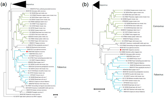 - Sidharthan, V.K.; Rajeswari, V.; Baranwal, V.K. Analysis of Public Domain Plant Transcriptomes Expands the Phylogenetic Diversity of the Family Secoviridae. Virus Genes 2022, 58, 598–604. [Google Scholar] [CrossRef] [PubMed]