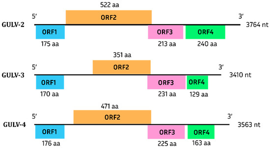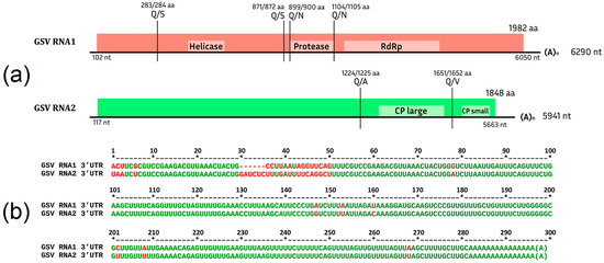 In 2015, a study of molecular diversity among GSyV-1 isolates in the CP gene sequences showed the division of isolates into two groups, the first of which consisted of two subgroups [88]. In this study, the whole-genome sequences of GSyV-1 were also divided into two groups, with three subgroups allocated to the first group (Supplementary Figure S12). Thus, four molecular groups of GSyV-1 were identified. The isolate assembled in this study belonged to the second group.