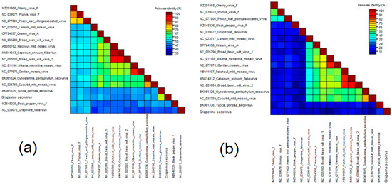 De novo assembly was carried out using the SPAdes (default settings) and Geneious assemblers (medium-low sensitivity). Contigs were compared to the NCBI reference viral genome database (accessed on 15 September 2022) using the tblastx algorithm. The results were displayed in a hit table, with a max E-value of 0.05. For further analysis, contigs of plant viruses with E-value ≤ 1 × 10−40 were selected. In parallel with de novo assembly, preprocessed reads were mapped with medium-low sensitivity (maximum mismatches per read 20%) to the reference genomes of grapevine viruses and viroids (accessed on 24 June 2023).